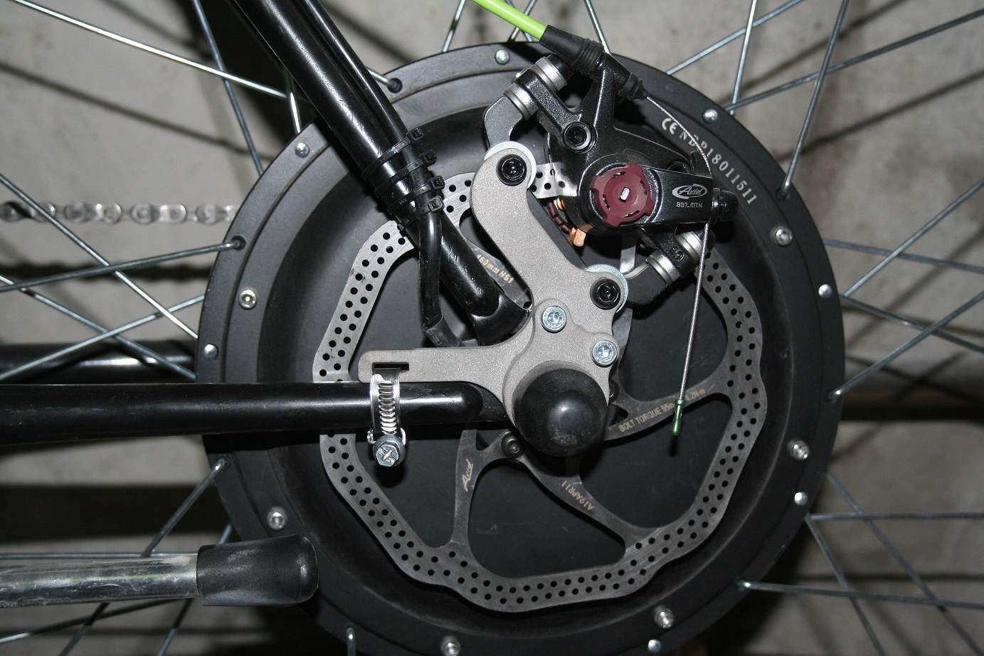 На передней вилке у меня уже есть IS крепления, а на заднем колесе сделали IS на усилителе рамы: